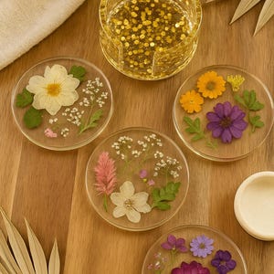 Floral Resin Coaster Set: Epoxy Coasters with Pressed Flowers for Kitchen Decor