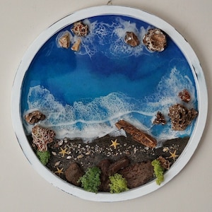 15.8″ seascape resin painting, ocean resin art, beach themed epoxy painting, moss wall art